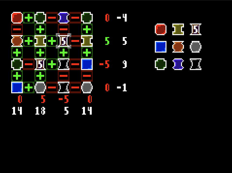 - The goal is to make each row and column sum match its target. You'll know you won when all of the sums are green (this is still too much of a prototype to have any actual celebration on-screen).